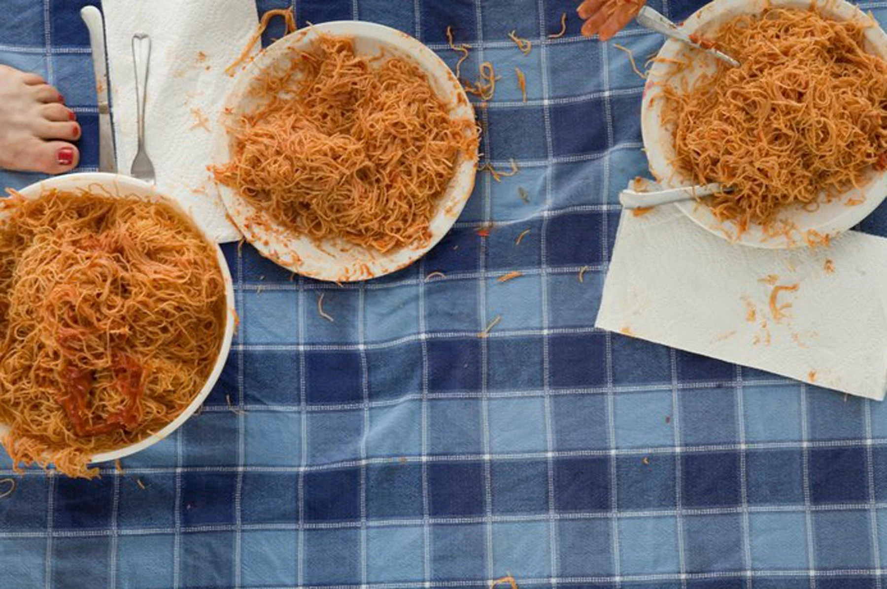 Spaghetti CO. is a live performance saga by choreographer Alice Gosti. Each episode starts with 3 women, wine and a huge bowl of tomato-sauce spaghetti.